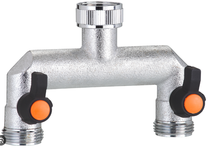 Η διπλή παροχή για βρύσες με σπείρωμα 3/4"  επιτρέπει την ροή δύο χρονομέτρων νερού. Είναι μεταλλική από ορείχαλκο ένα σκληρό και ανθεκτικό υλικό, που διατηρεί την γυαλάδα του χωρίς να οξειδώνεται από τις καιρικές συνθήκες και τις ακτίνες του ήλιου.